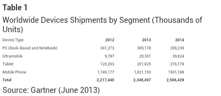 Este aumento se produce a pesar del descenso continuado de los ordenadores de sobremesa y portátiles. Gartner prevé que los PC sufran una bajada de ventas en todo el mundo del 10,6%, hasta los 305 millones de unidades. La caída en las ventas de PC se debe al aumento de la demanda de dispositivos móviles, pero también al periodo de impasse de la industria antes del lanzamiento de los nuevos productos en la segunda mitad del año.