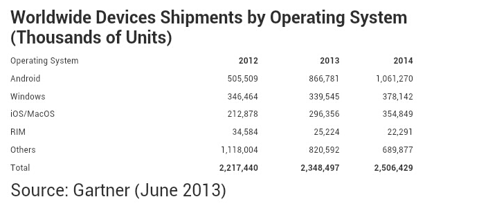 Según la Gartner es sorprendente la subida de Android como primer sistema operativo aumentando en 2 años de 2012 a 2014 en un 50 %.